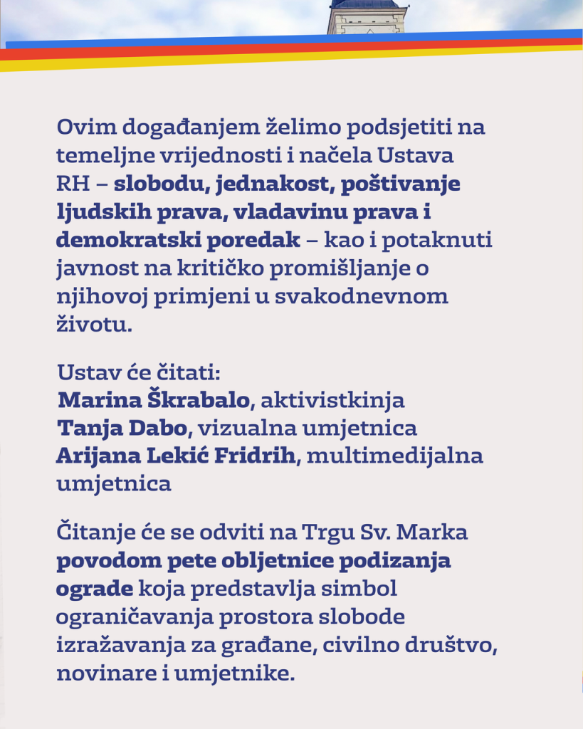 Ovim događanjem želimo podsjetiti na temeljne vrijednosti i načela Ustava RH – slobodu, jednakost, poštivanje ljudskih prava, vladavinu prava i demokratski poredak – kao i potaknuti javnost na kritičko promišljanje o njihovoj primjeni u svakodnevnom životu. Čitanje će se odviti na Trgu Sv. Marka povodom pete obljetnice podizanja ograde koja predstavlja simbol ograničavanja prostora slobode izražavanja za građane, civilno društvo, novinare i umjetnike.