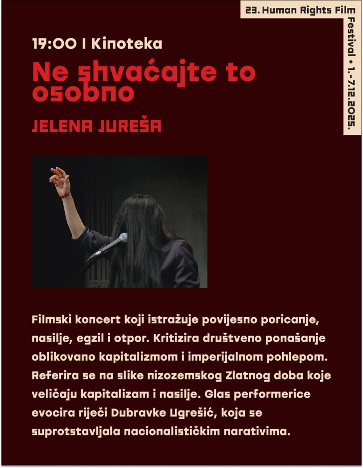 Večeras 4.12.2025. u 19:00 u sklopu Human Rights Film Festivala u Zagrebu prikazuje se dokumentarno-eksperimentalni film Ne shvaćajte to ozbiljno Jelene Jureše u belgijsko-hrvatskoj produkciji; riječ je o filmskom koncertu koji istražuje povijesno poricanje, nasilje, egzil i otpor. Kritizira društveno ponašanje oblikovano kapitalizmom i imperijalnom pohlepom. Referira se na slike nizozemskog Zlatnog doba koje veličaju kapitalizam i nasilje. Glas performerice evocira esej Dubravke Ugrešić, koja se suprotstavljala nacionalističkim narativima te upozorava: od mikroagresija do genocida, od masakra do kapitalističkih sustava kontrole. U filmu nastupaju plesačica Marije Nie te glazbenici Alen i Nenad Sinkauz.