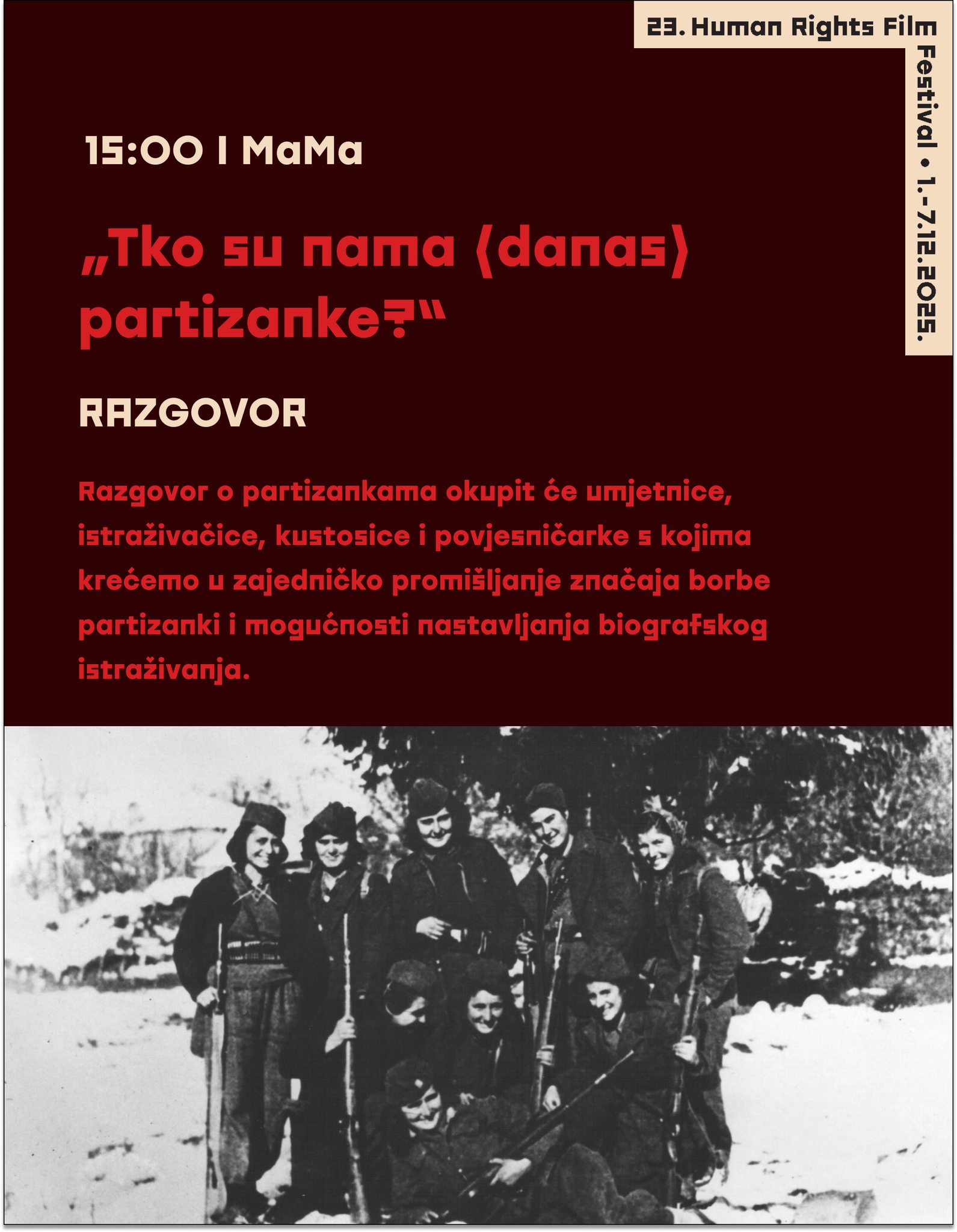 Klub MAMA, srijeda 3. prosinca 2025. u 15:00 Pozivamo vas da nam se pridružite na razgovoru o partizankama, koji će okupiti umjetnice, istraživačice, kustosice, povjesničarke i istraživačice. Dva su povoda od kojih krećemo u zajedničko promišljanje značaja borbe partizanki i … Nastavi čitati Razgovor “Tko su nama (danas) partizanke?”